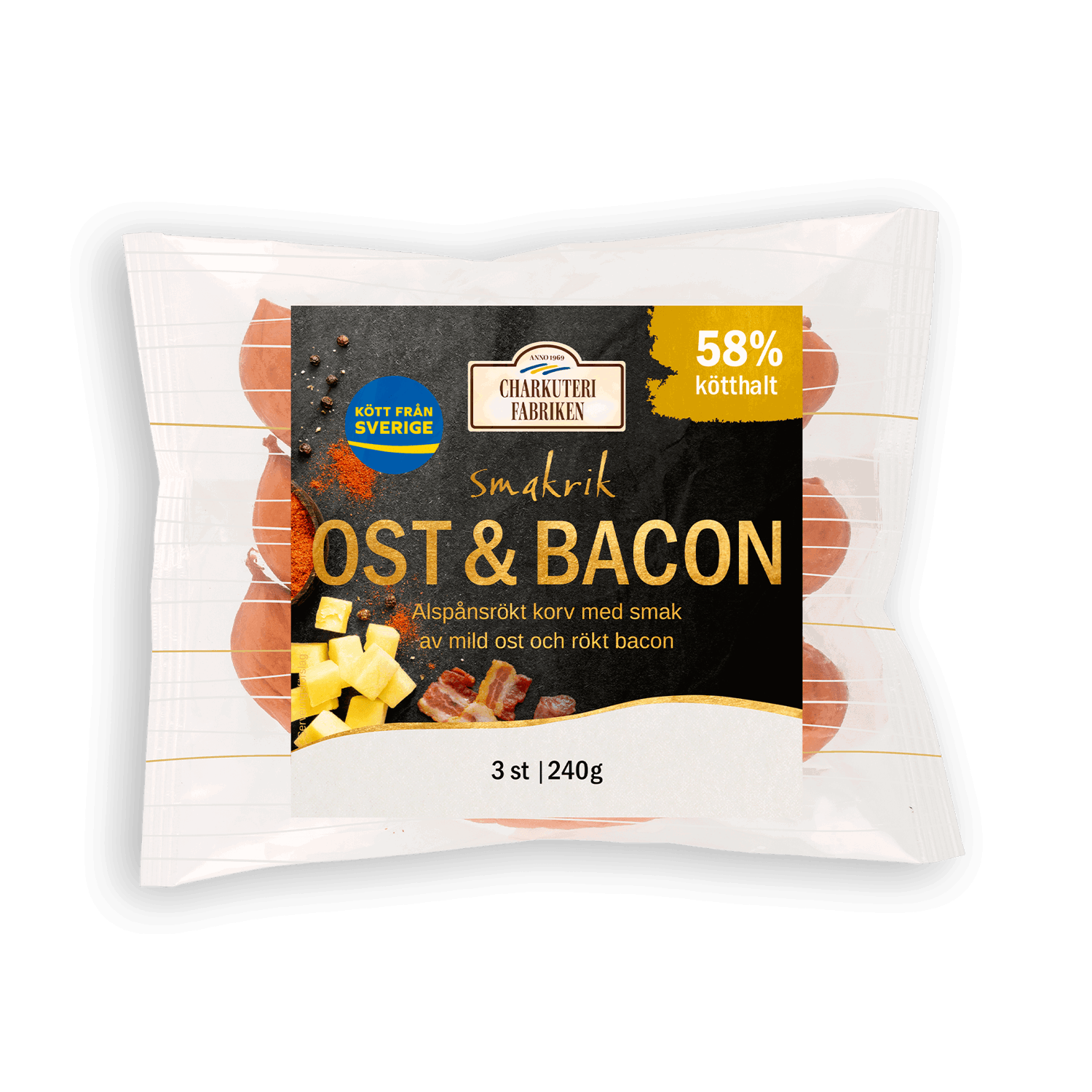Upplev en härlig smakkombination med vår ost och baconkorv från Charkuterifabriken. Tillverkad med omsorg och passion med svenskt kött, varje tugga bjuder på en god mix av baconets sälta och ostens krämighet.