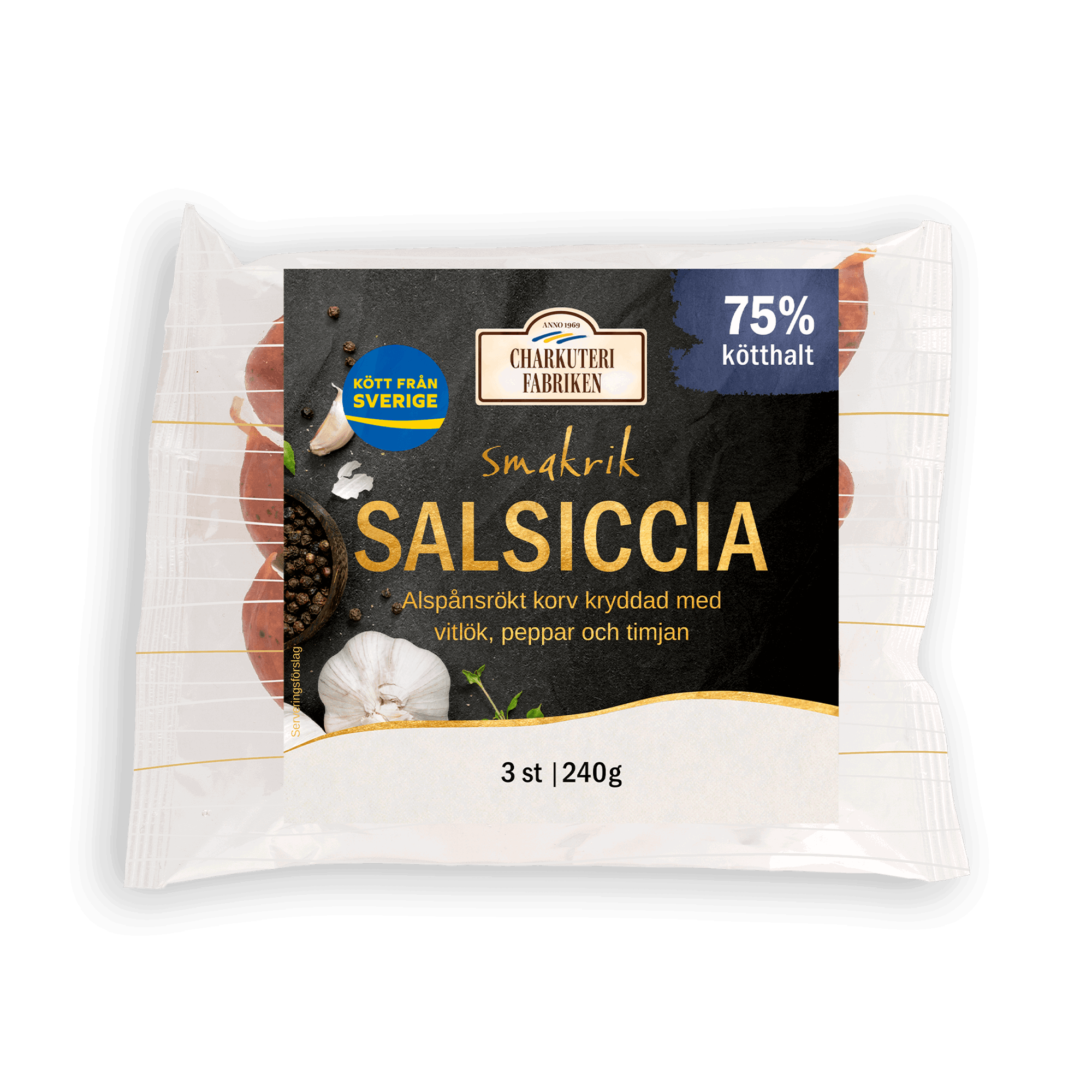 Ingredienser: Gris*- och nötkött* (47%), vatten, bacon* (11%) , potatisstärkelse, OST 6% (MJÖLK*, salt, ystenzym, kalciumklorid E509, syrningskultur), salt, druvsocker, kryddor (vitpeppar, muskotnöt, ingefära, paprika), lök,stabiliseringsmedel E450, antioxidationsmedel (E300, E301), konserveringsmedel E250, rökarom. *Ursprung Sverige.Stoppad i naturtarm från gris. Alspånsrökt.