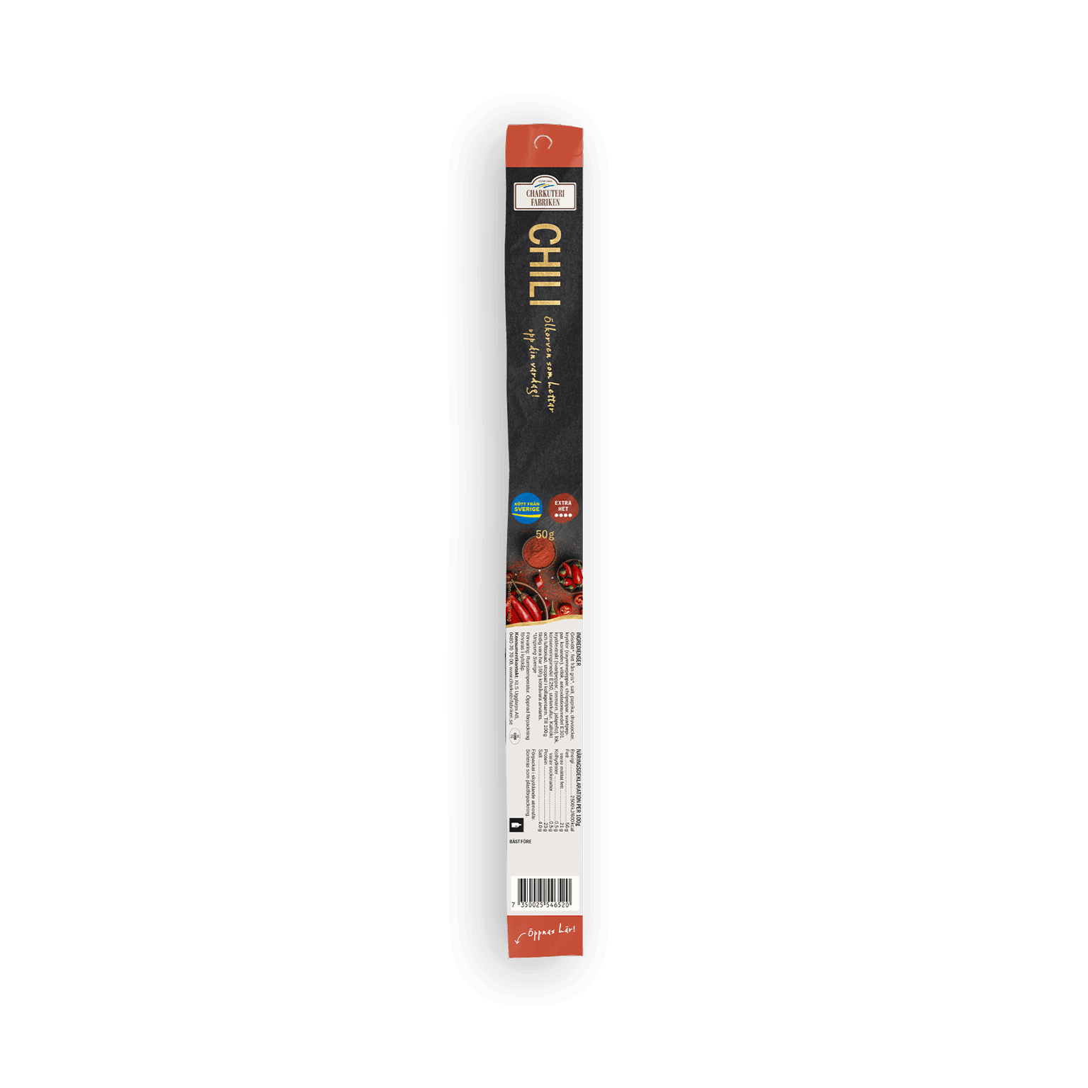 Ingredienser: Griskött*, salt, fett från gris*, paprika, kryddor (cayennepeppar, chilipeppar, svartpeppar, koriander), druvsocker, vitlök, antioxidationsmedel (E301), kryddextrakt (svartpeppar, rosmarin, jalapeño), lök, konserveringsmedel (E250), starterkultur.Kallrökt och lufttorkad, stoppad i kollagentarm. Till 100g färdig vara har 160g köttråvara använts.*Ursprung Sverige.