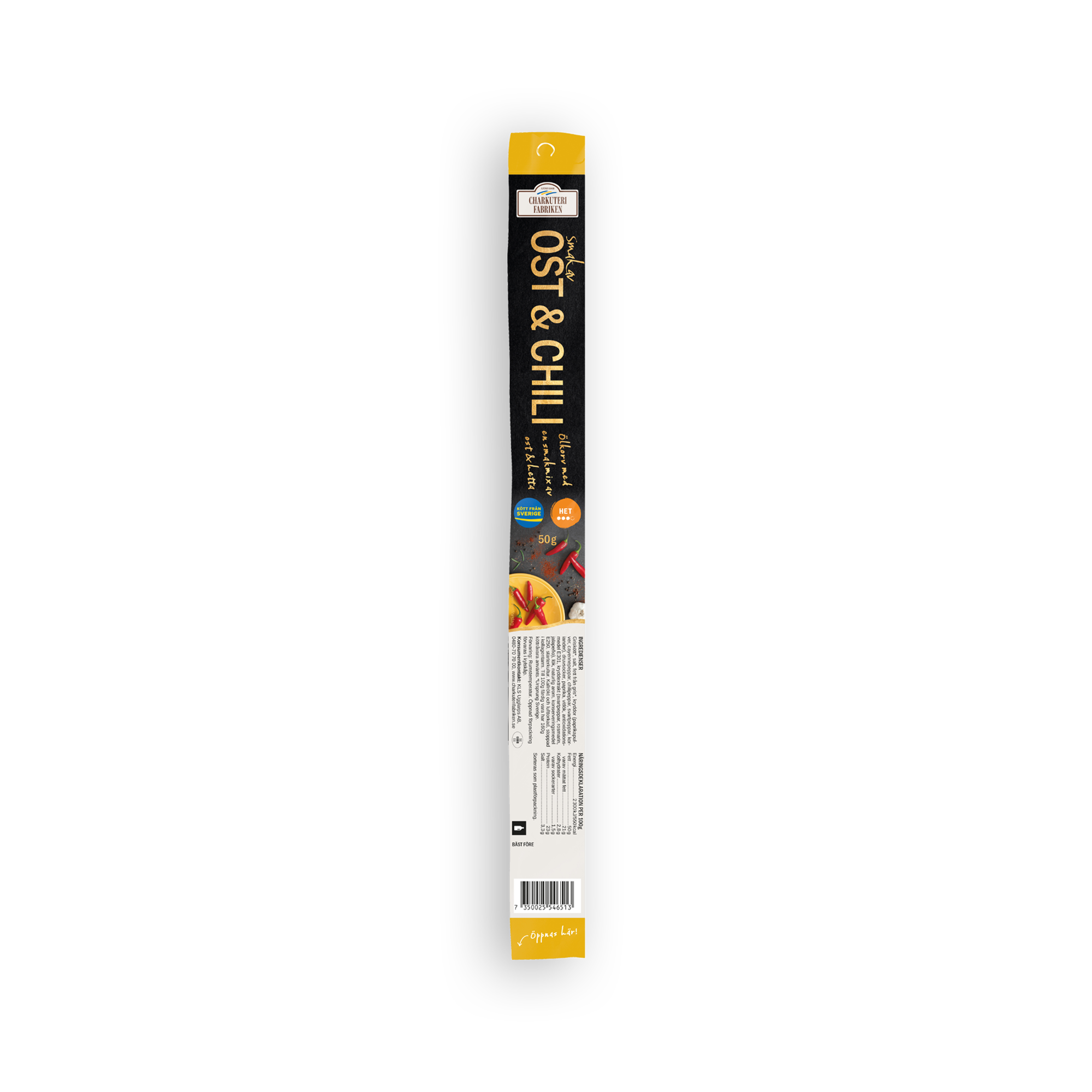 Ingredienser: Griskött*, salt, fett från gris*, kryddor (paprikapulver, cayennepeppar, chilipeppar, svartpeppar), druvsocker, lök, vitlök, antioxidationsmedel (E301), kryddextrakt (svartpeppar, rosmarin, jalapeño), konserveringsmedel (E250), starterkultur.Kallrökt och lufttorkad, stoppad i kollagentarm. Till 100g färdig vara har 160g köttråvara använts.*Ursprung Sverige.