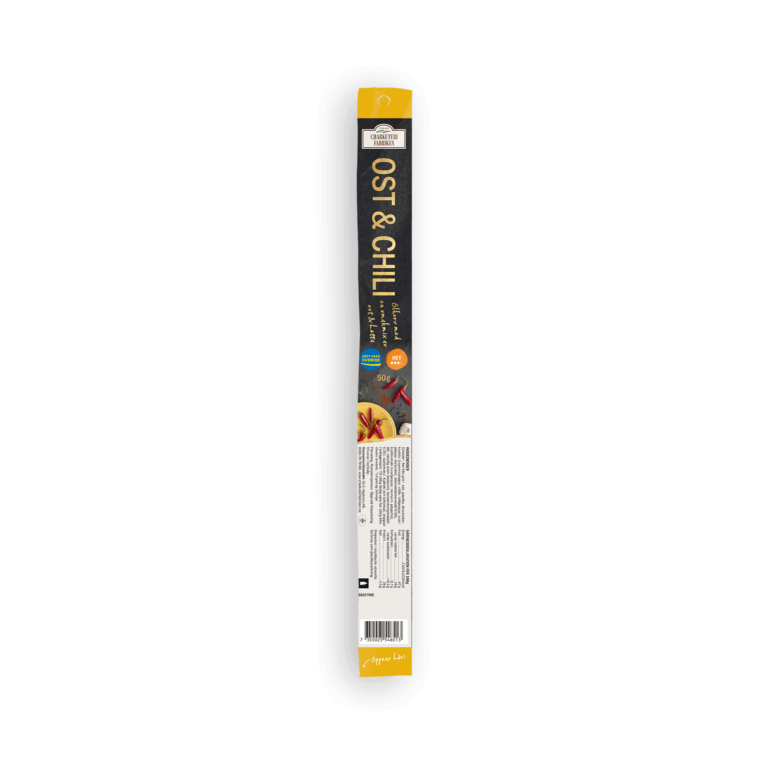 Ingredienser: Griskött*, salt, fett från gris*, paprika, kryddor (cayennepeppar, chilipeppar, svartpeppar, koriander), druvsocker, vitlök, antioxidationsmedel (E301), kryddextrakt (svartpeppar, rosmarin, jalapeño), lök, naturlig arom (OSTarom), konserveringsmedel (E250), starterkultur.Kallrökt och lufttorkad, stoppad i kollagentarm. Till 100g färdig vara har 160g köttråvara använts.*Ursprung Sverige.
