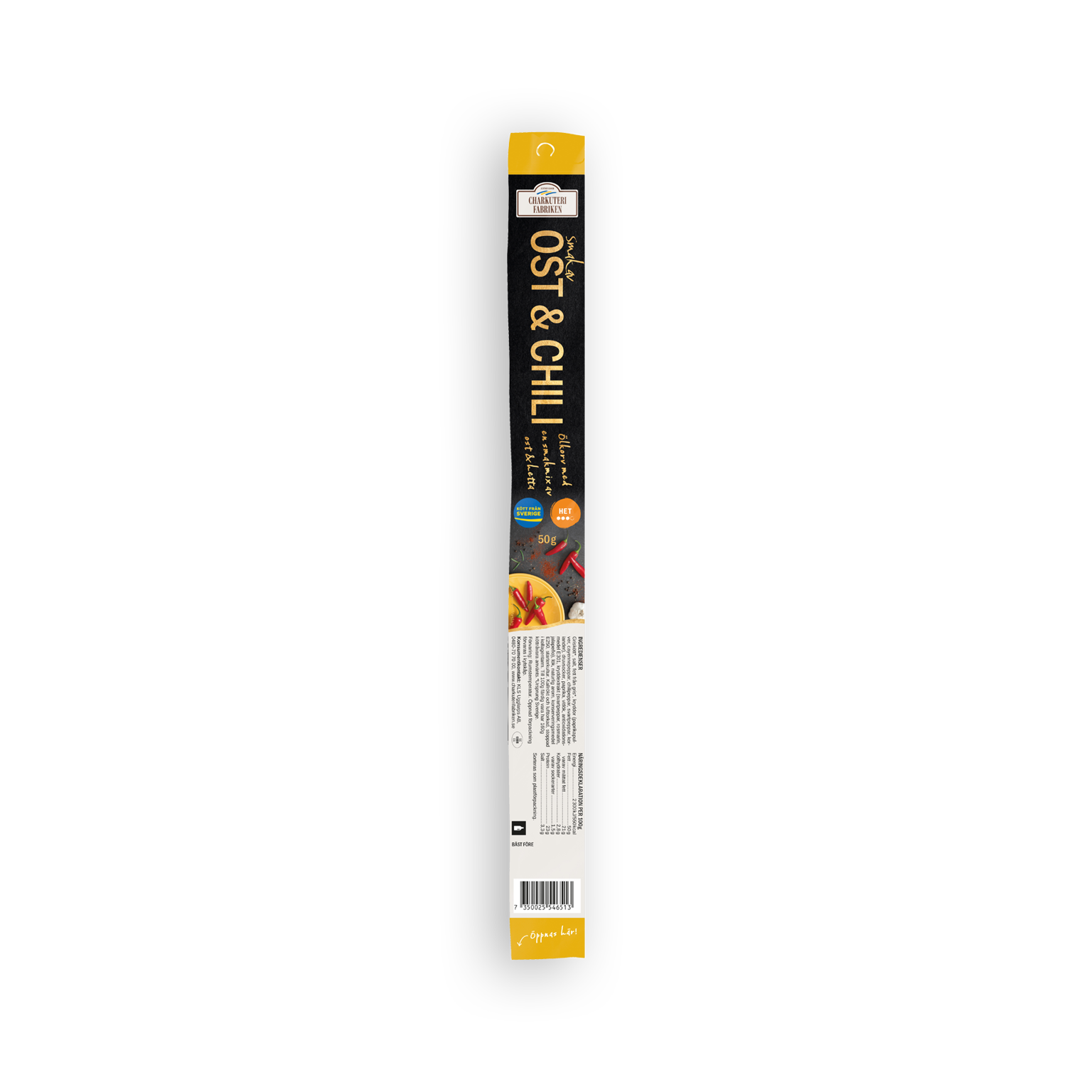 Ingredienser: Griskött*, salt, fett från gris*, kryddor (paprikapulver, cayennepeppar, chilipeppar, svartpeppar, koriander), druvsocker, paprika, vitlök, antioxidationsmedel E301, kryddextrakt (svartpeppar, rosmarin, jalapeño), lök, naturlig arom, konserveringsmedel E250, starterkultur.Till 100g färdig vara har 160g köttråvara använts.*Ursprung Sverige.